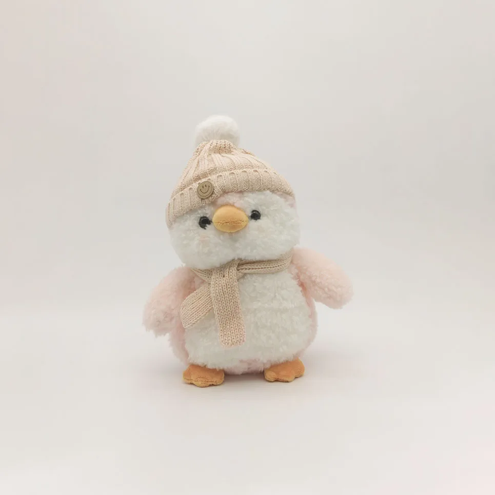 Shop the Plush Penguin at Pinknino. Adorable pink penguin plush toy dressed in scarf and hat. Soft and lightweight, ideal for cuddling, gifting, or desk decoration.